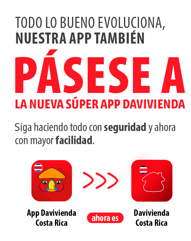Vea este video y descubra másLa nueva aplicación Davivienda Costa Rica reemplazará a la anterior con nuevas funcionalidades, servicios y una forma más sencilla de hacer todas sus transacciones. Esto no es una actualización del App Davivienda.